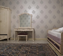 * Вторая спальня порадует родителей с детьми: одноместная кровать дополнена детской кроваткой, большим шкафом для вещей и туалетным столиком.
