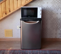 * Просторная гостиная с функционалом кухни: мини-холодильник, микроволновка, обеденный стол и набор посуды, включая чайник, набор для приготовления чая и кофе.