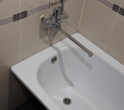 * Современная ванна, объединённая с санузлом, в котором есть зеркало и фен.