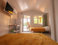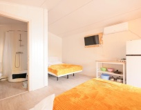 Внутри домика - кондиционер, двуспальная и односпальная кровати, телевизор, холодильник, санузел