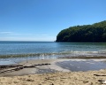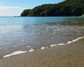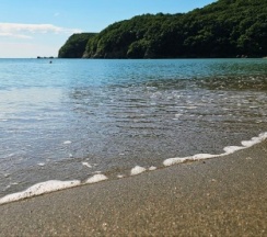 Очень чистый берег с мелким песком и тёплым морем.