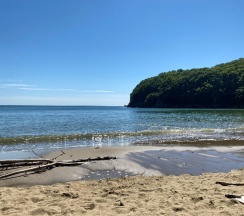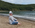 До моря минут восемь спускаться вниз, бухта небольшая (мыс Лисий) пляж - мелкий песок, дно песчаное, вода чистая