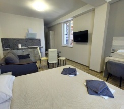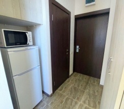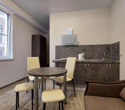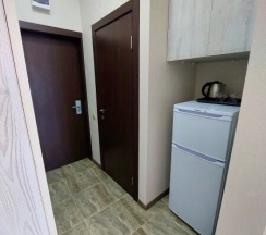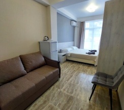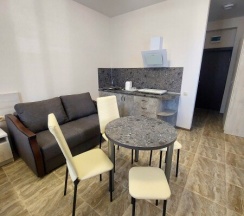 Уютный номер-студия с балконом, откуда открывается вид на горы. Компактная и удобная кухня со всем необходимым для приготовления пищи. Номер идеально подходит для пар и семей с детьми (вмещает до 2-х до 4-х человек). Ощутите комфорт, как дома, во время вашего отдыха.