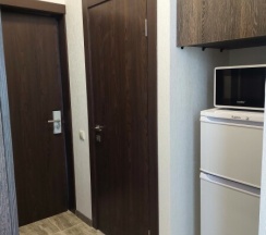 Кухня в номере оснащена: холодильником, чайником, микроволновой печью, столовыми приборами с посудой, индукционной плитой и вытяжкой, а так же полуторным диваном, обеденным столом и большим плазменным телевизором.
