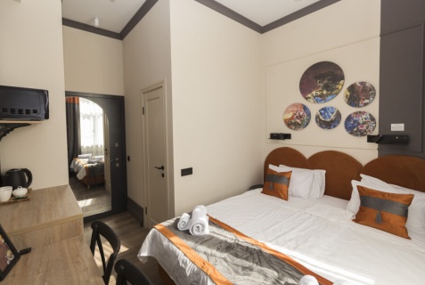 Номер выполнен в современной интерпретации русского стиля. В нем вы найдете все необходимое для комфортного проживания: Мини-кухня Личная ванная комната, Smart TV, бесплатный WI-FI, утюг и гладильная доска. Несколько сортов чая и кофе