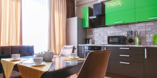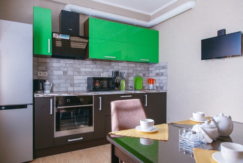 - Большая кухня, выполненная в сдержанных тонах, оборудована современным гарнитуром и всей нужной для длительного проживания бытовой техникой. Полный комплект разнообразной посуды и кухонной утвари на четыре персоны гостей позволит приготовить привычные блюда на свой вкус. Уютная обеденная зона с мягкими стульями располагает к приятной трапезе или чаепитию. ЖК- телевизор на стене привнесет разнообразие в повседневные дни. Здесь же расположено второе спальное место - комфортный раскладной диван.