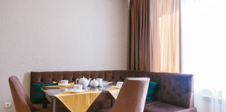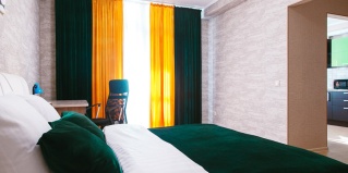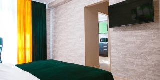 - В просторной светлой комнате удобная двуспальная кровать с ортопедическим матрасом способствует полноценному отдыху и безмятежному сну. Плотные портьеры гарантируют светоизоляцию. На прикроватной тумбе предусмотрен светильник для уютного вечернего чтения перед сном. Во вместительном шкафу-купе можно хранить личные вещи. Досуговое времяпрепровождение обеспечит ЖК-телевизор с большой диагональю со множеством каналов и высокоскоростной Wi-Fi. Присутствует рабочая зона с письменным столом, регулируемым по высоте стулом и дополнительным освещением. Комфортному личному уходу послужит туалетный уголок с трюмо, зеркалом и пуфом с мягкой обивкой.