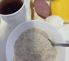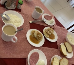 Завтрак включен в стоимость проживания: порция каши, чай/кофе, нарезка из хлеба, колбасы, сыра, вареные яйца, один день давали блины, на второй печенье к чаю. Завтрак простой, но наесться можно вполне.