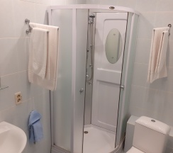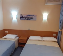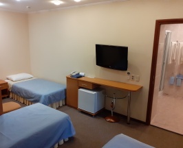 Трехместный однокомнатный номер. Одна 2-спальная кровать и одна 1-спальная кровать. с/у с душевой кабиной, мини-холодильник, кондиционер, телевизор, телефон, фен.