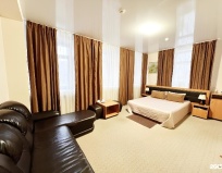 Бронировали номер Люкс на Горького в здании автовокзала. Очень понравился номер. Он отдельно от всех на 4 этаже. Все остальные номера на 3 этаже. Номер как отдельная квартира со всеми удобствами. Все полностью соответствует фотографиям на сайте. Прекрасный номер! Есть отдельная комната-спальня и гостиная-кухня. Если кто-то в гостиной смотрит ТВ или гремит на кухне, в спальне не мешает. В каждой комнате телевизор, в спальне есть детская кроватка и раскладушка, если вдруг гостей много. 5 человек могут спокойно разместиться в номере. Очень тепло в номере. Посторонний шум не мешает отдыхать. Есть небольшой холодильник, микроволновка, плита. Несколько сценариев освещения.
