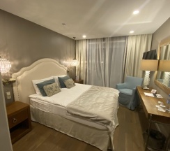 У мены был небольшой номер, в нем кровать двуспальная, есть огромное зеркало, светильники, ночники над кроватью, небольшой шкаф с вешалками, сейф, холодильник, кондиционер, чайник. Матрас хорошей жесткости, не проваливался. У номера балкон со столом и креслами. Оценить, насколько номер холодный, не могу, была в конце августа, еще на улице было тепло.