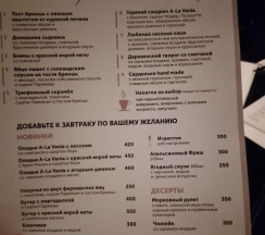 Очень впечатлил бар-ресторан, и антуражем, и едой. Вкусно, разнообразно. Завтраки объемные. Есть спешл-меню от шефа, при мне было тематическое с лисичками, явно свежими, а не замороженными. Годные настойки, особенно «ностальгическая вишня на коньяке» и яблоко с корицей, коктейль «лимонный тарт», очень вкусный кофе, и американо, и капучино, если будет бариста-мужчина. Еда тоже понравилась, и завтраки и по меню. Из завтраков больше всего зашли «сардельки хэн-мейд» с зеленым горошком. Видела по отзывам, что мужчины иногда жалуются на объем завтрака, но мне было за глаза, к тому же можно взять что -то дополнительное за фиксированную цену, если не наелись.