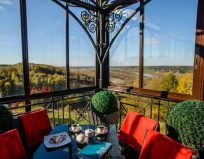 Гуляли свадьбу в банкетном зале отеля, все было просто отлично. Большое меню, много закусок, салатов, хороший выбор вин, обслуживание хорошее, официанты лавировали межу гостями только так. На террасе открывается вид на широкую реку и леса, очень красиво.