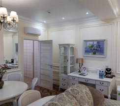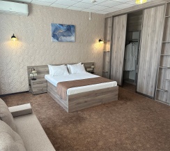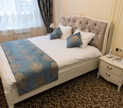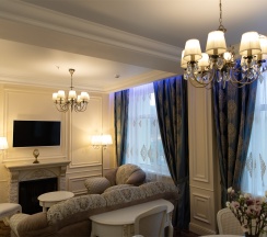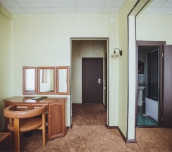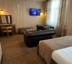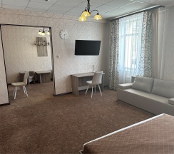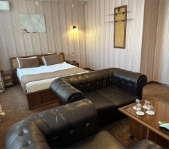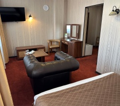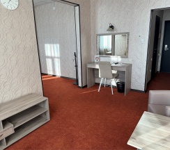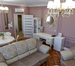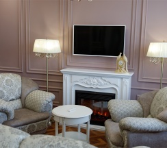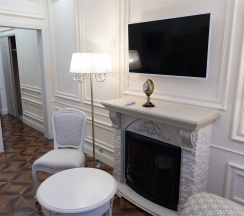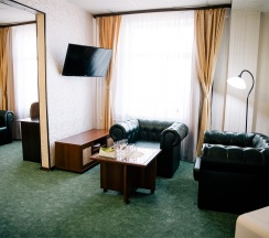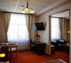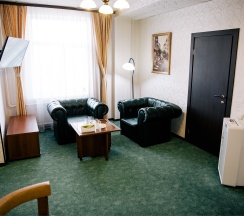 Изысканный, роскошный, просторный и элегантный номер, выполненный в интерьере для максимально комфортного как одноместного, так и двухместного размещения. Неповторимое великолепие номера подчеркнет особый статус гостей. Номер данной категории состоит из двух комнат: спальни и гостиной. В номере имеется спальная зона с удобной двуспальной кроватью, рабочая зона с функциональным рабочим столом и чайным набором, обеденная зона, гостиная зона с диваном, двумя креслами и столиком, и просторная ванная комната с бодрящим душем, расслабляющей ванной и расширенным косметическим набором. Уникальной особенностью в номерах является гостиная, оборудованная камином, позволяющая насладиться гармонией и уютом. Обе комнаты номера оснащены кондиционером. Номера данной категории с видом на город. Средняя площадь номера 54 кв.м.