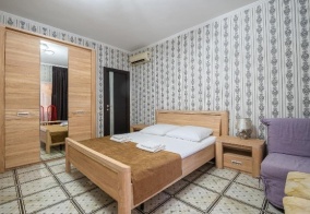 Отдыхали в гостевом доме 6 ночей в июне. Приехали утром в 9 часов, естественно заселяют в 14.00, но нам дали ключ, чтоб мы посмотрели номер. Номер бронировали на 6 этаже мансарда, на выбор либо маленький, но с балконом, либо побольше, но без оного. Выбрали с балконом, есть сушилка, ванна полноценная, двуспальная кровать, фен, чайник. Короче понравилось. Нагулялись вдоволь, заселились в 13.00. В номере всё работает, видно море с балкона, места маловато даже для двоих. Плохо, что нет столика и лифта, на 6й этаж реально тяжко подниматься пешком. На каждом этаже есть микроволновка и утюг с гладильной доской. Персонал отзывчивый и позитивный. Галина на ресепшене только слишком серьёзная))), зато Лора на позитиве всегда)), тем не менее пульт от кондиционера, вазу для цветов, столовый прибор и бокал любезно предоставили. Расположение у гостевого домика отличное, 200 метров до моря и вокруг огромное количество кафешек, столовых, парковых зон и всевозможных локаций, остановка автобуса в 200 метрах - доехать в любую точку. Отдохнули отлично, плохо - ранний выезд в 10 часов, но вещи можно оставлять на ресепшене и спокойно гулять. Пришли с пляжа, переоделись и пешком за 40 минут дошли от отеля до аэропорта. Кстати рядом пунты озона и валбериса, можно выписать до приезда туда шампунь или крем для загара, чтоб не везти жидкости в ручной клади
