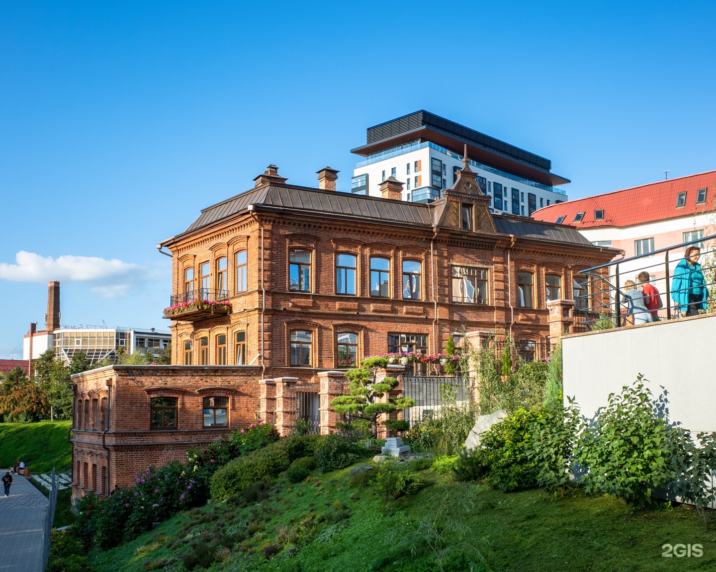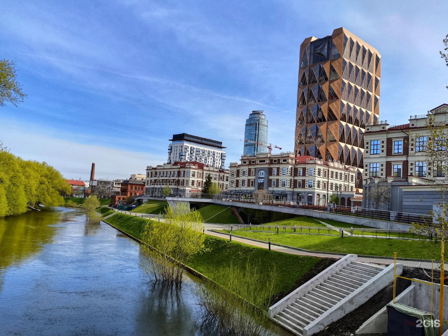 Дом построен лесенкой на крутом берегу Исети. Нижняя ступенька здания спускается к самой воде.