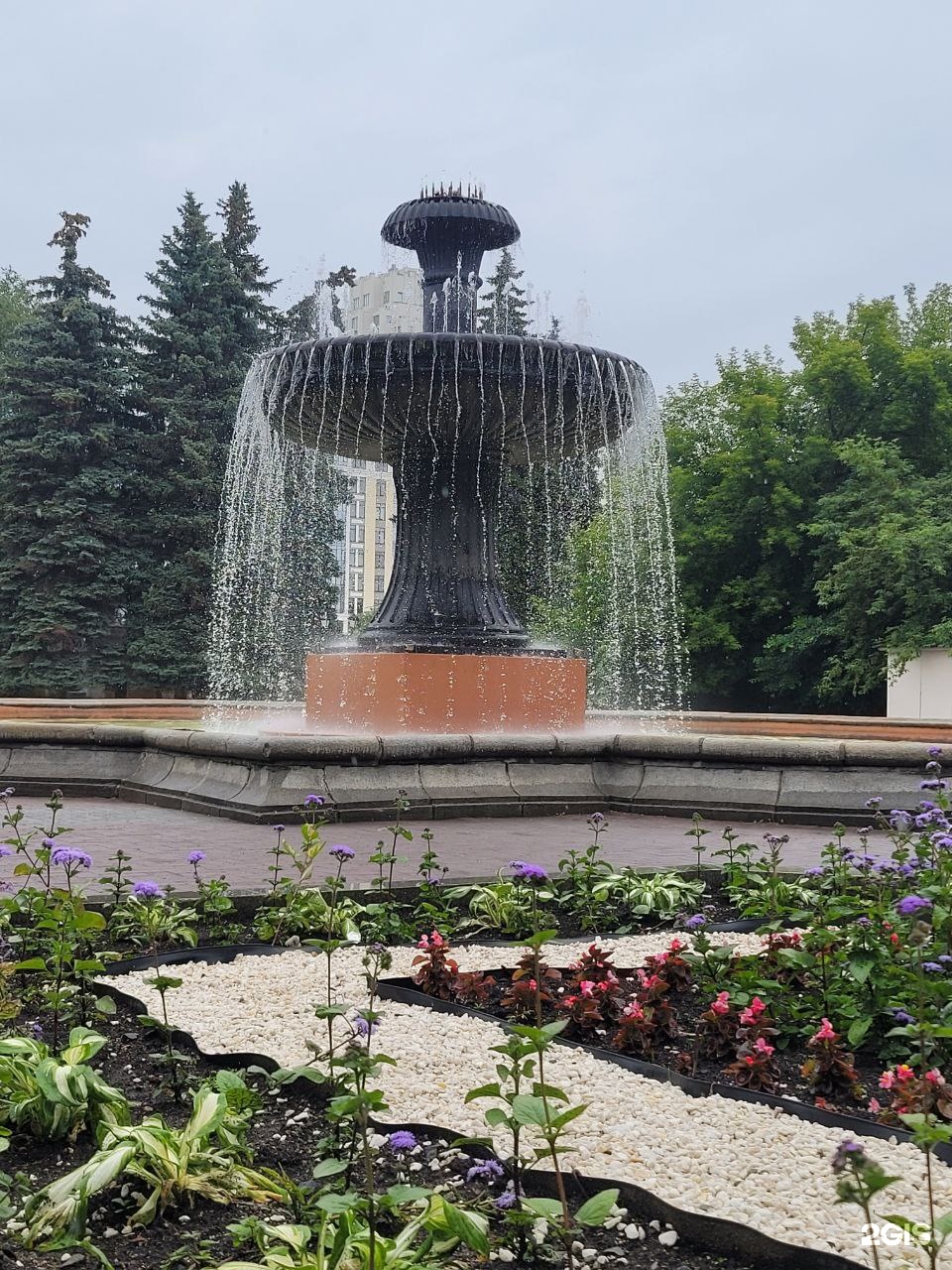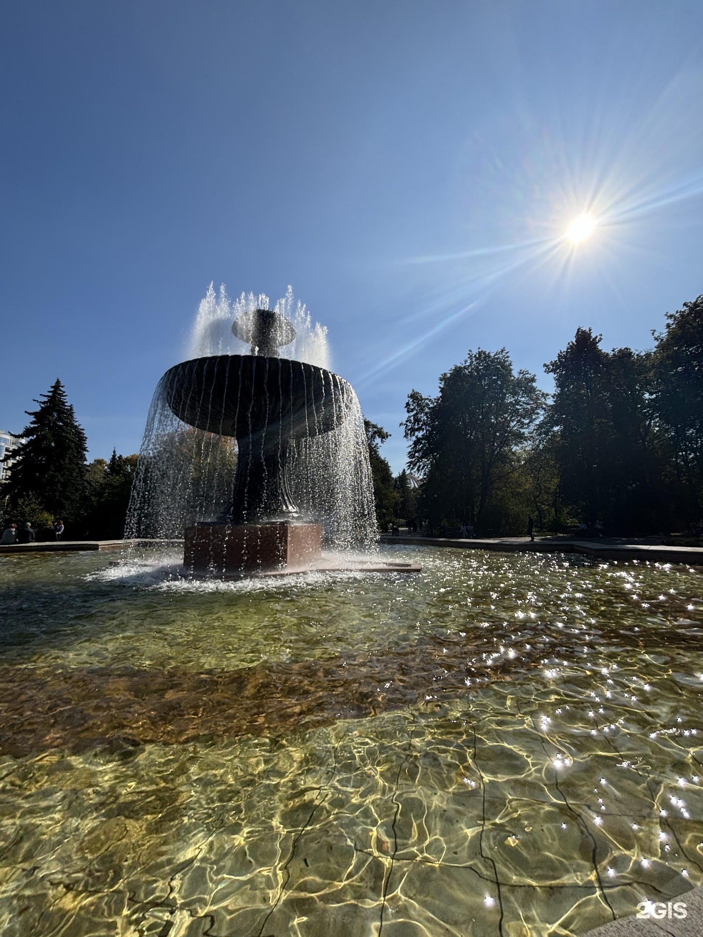 Фонтан, высотой около 7 метров, литой чугунной чашей и вместимостью гранитного бассейна около 400 куб. м. находится в центральной части дендрария.