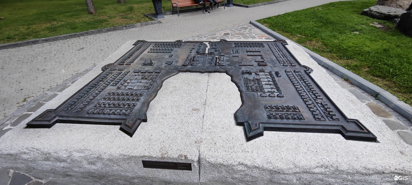 Бронзовый макет завода-крепости, который отображает градостроительный ансамбль Екатеринбурга 1733-1734 годов в масштабе 1:300. Постамент, вес которого составляет 16 т, изготовлен из гранита Камбулатовского месторождения, масса бронзовой части при этом - около 1 т. Объект был выполнен к 300-летию Екатеринбурга в рамках проекта "Туризм и индустрия гостеприимства". Формовочные и литейные работы произведены на основе 3D-модели, построенной по архивным данным. Изготовлен Литейным домом "Дубровин" при содействии "Плотинка - бюро".