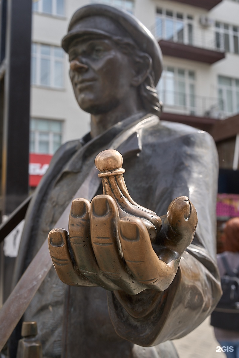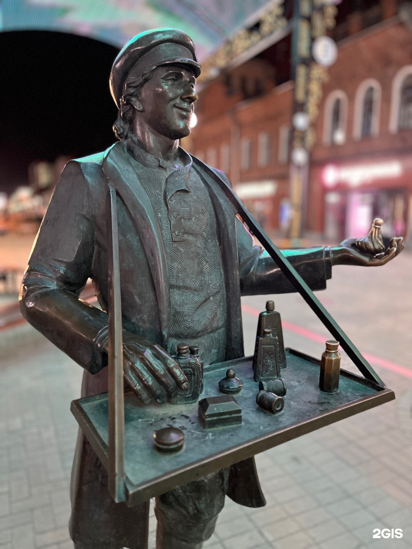 Бронзовый "Коробейник" выделяется среди прохожих ростом и своим внешним видом - в сюртуке, с лотком, на котором флакончики с духами, пудра и катушки с нитками. Фигура выполнена из бронзы, с элементами техники каслинского литья. Вес скульптуры около 700 кг и значительная его часть, длиной около метра находится под землей.