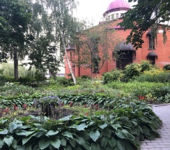 Тишина и умиротворение. Идеальная чистота территории. Красивая клумба с цветами , пение птиц . Все это очень успокаивает.Поражает своим величием старая колокольня и кирпичная стена , примыкающая к ней.