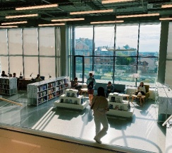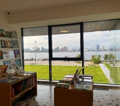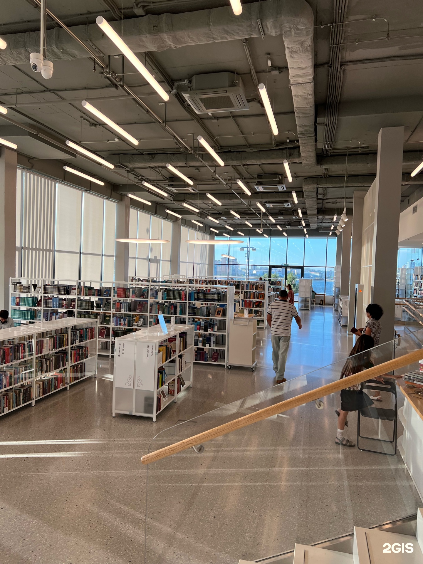 Огромный ассортимент книг на любой вкус, есть компьютерный зал, где можно поработать или поучиться, большой просторный читальный зал со всеми удобствами, большая общая зона с диванчиками, пуфиками, столиками, кофетерием и панорамными окнами, так же есть зона где периодически проходят разные картинные и фотовыставки, и на десерт шикарная терасса с прекрасным видом на набережную и город!