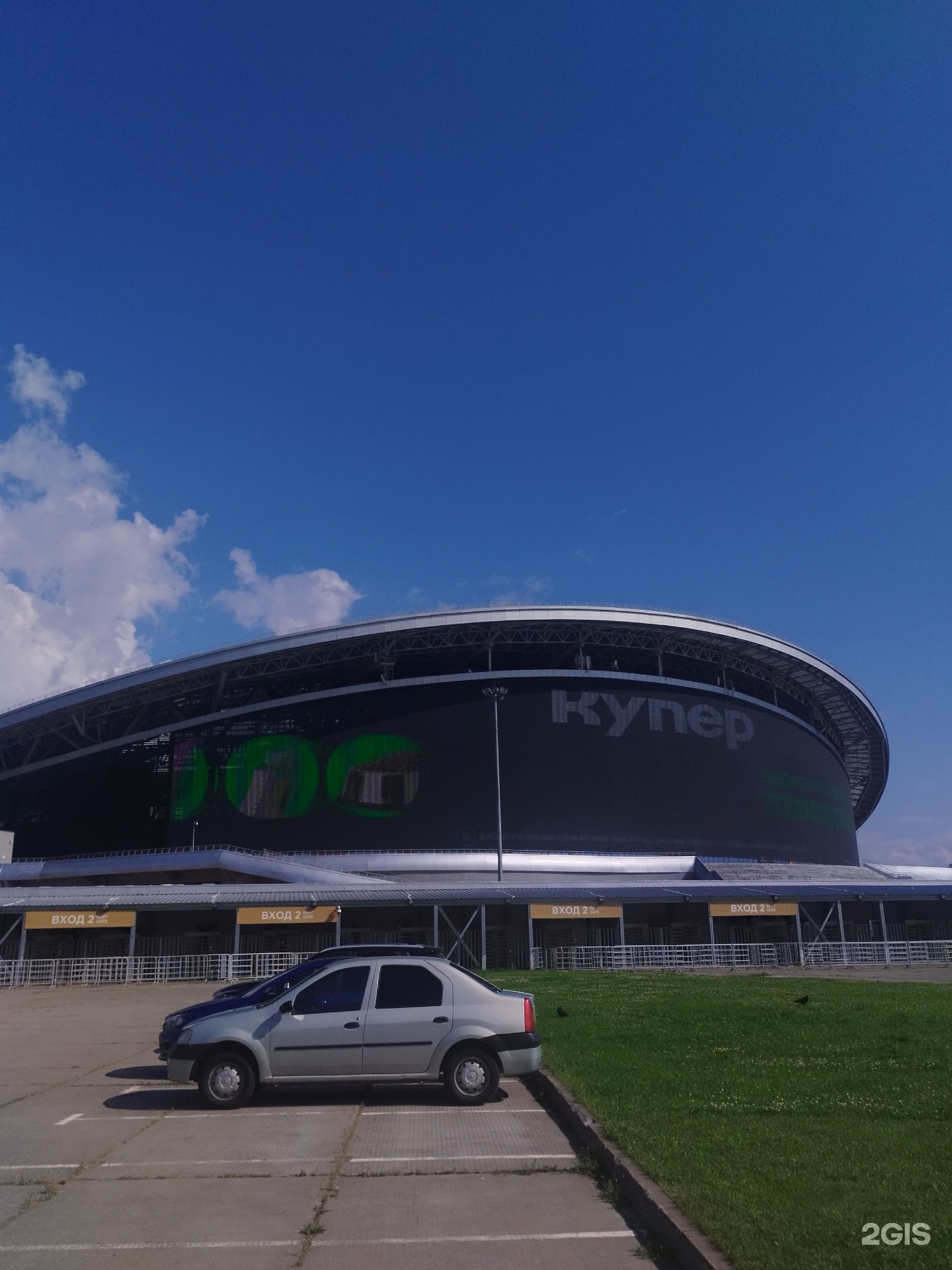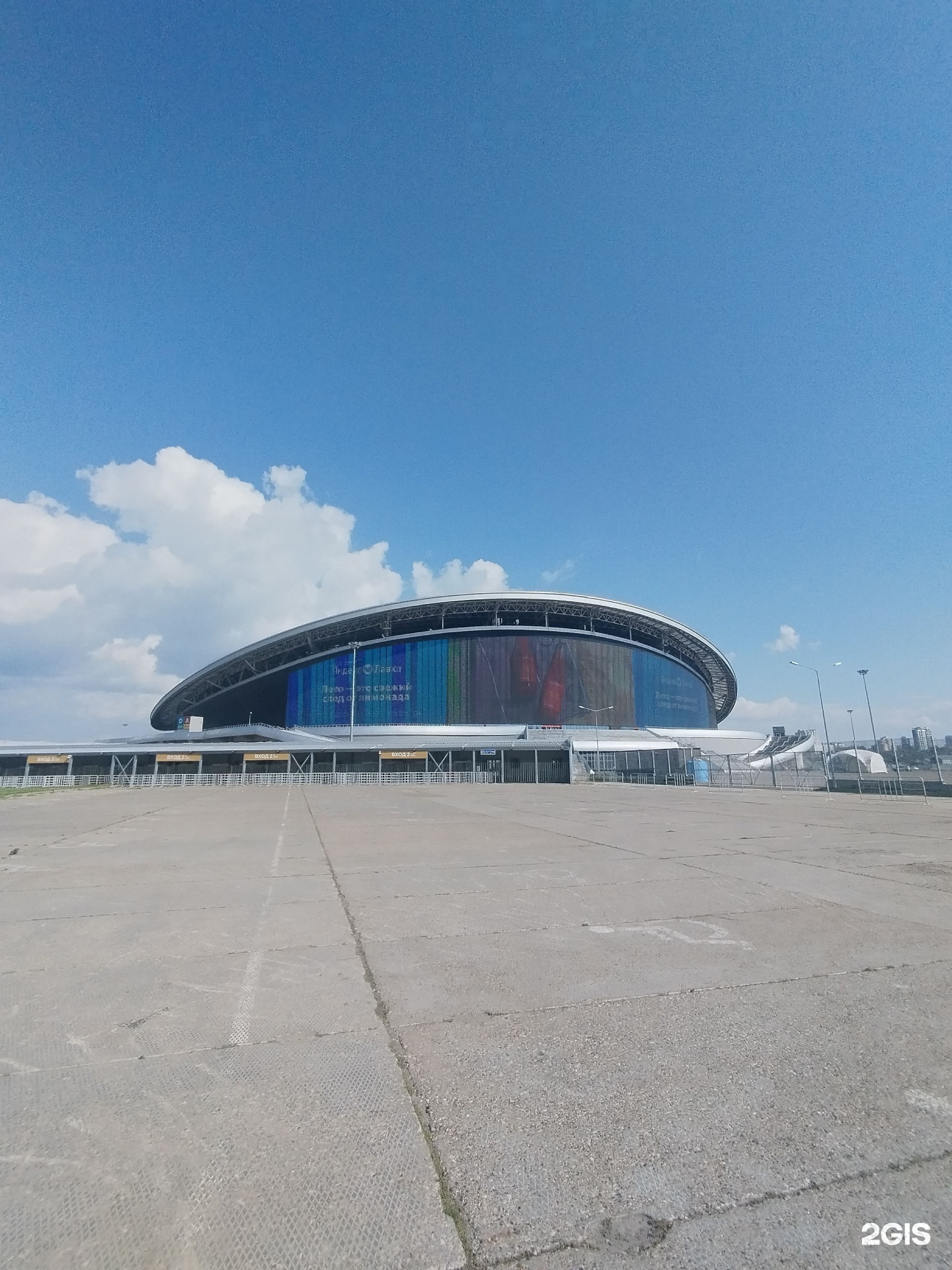 "Один из самых вместительных стадионов находится в Ново-Савиновском районе, вблизи правого берега реки Казанки. Построен специально к чемпионату мира по футболу в 2018 году. По задумке архитекторов крыша арены должна напоминать цветок лилии. Ещё одна особенность арены — «Медиафасад», крупнейший в Европе экран в формате Full HD.