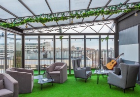 На четвертом этаже есть кофеварка, туалет и веранда с мягким диваном и навесом, можно приятно посидеть.