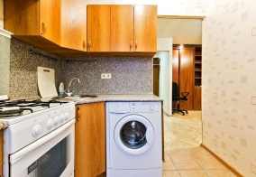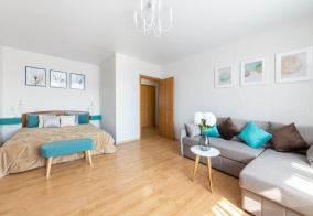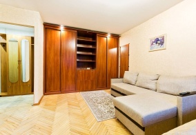 В апартаментах возможно размещение до 4 гостей. В комнате установлены: двуспальная кровать, большой раскладывающийся угловой двуспальный диван, зеркальный платяной шкаф, тумба-комод с телевизором. На кухне – гарнитур, обеденная зона – стол с двумя стульями. Санузел с ванной раздельный, ванная комната в плитке до потолка – евростандарт. В прихожей есть вешалка для верхней одежды и полочка для обуви.