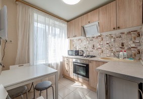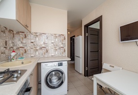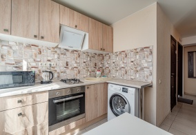 Оснащение апартаментов: WI-FI, телевидение, бытовая техника, варочная панель, холодильник, СВЧ, стиральная машина. Двуспальная кровать и раскладывающийся диван. Вместимость до 4 человек. Курение запрещено. Проживание с домашними животными не допускается.
