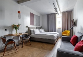 В целом, на твёрдую 4. Хотя мелких недочетов более, чем. Начну с хорошего. Это идеальное месторасположение. Вот прям идеальнейшее. При этом тихо, спокойно. Снимали апартаменты-студио. Не тесно. Кровать удобная. По ТВ много каналов. О недочетах: одеяло маленькое для такой кровати. Номер рассчитан на 3их (большая кровать и кресло-кровать). Одеяла всего 2. Таким одеялом двоим укрыться невозможно. Т. К. Мы проживали вдвоём, у каждого было своё одеяло. Далее, под шторкой валялся мужской носок. Уборка, соответственно, хромает. Табличка с просьбой убраться в номере провисела 2 дня. После звонка на ресепшн, уборка сделана была. Хотя это не уборка. Забрали мусор и положили рулон туалетной бумаги, 2 пакетика геля для душа. Потом тоже только мусор выносили. За 6 ночей полотенца не меняли, пол не мыли. Номер подразумевает кухонную зону. 5 абсолютно разных тарелок. 1 бокал для вина, 1 бокал для шампанского. 2 кружки и 2 бокала. Хотя бы парно все как-то.. А при том, номер вместимостью до 3ех человек. Посуды точно не хватит. Кухонный гарнитур очень разбитый. На ресепшене при заселении равнодушие. Про бесплатный кофе (как написано в описании) никто не говорил, по этому не знаю, есть ли это или нет. При выселении девочки были дружелюбней. Обычной улыбки, пожелания хорошего дня более, чем достаточно. Все-таки отель начинается и заканчивается с ресепшена...