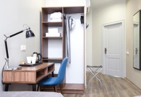 В номере чисто,есть все необходимое,в общем пользовании(в коридоре) есть микроволновка,утюг,гладильная доска,кулер. Место суперудобное -5 минут от дворцовой площади. НО 5 этаж без лифта не для всех.В целом,рекомендую.