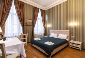 Классный номер по вполне приемлемой цене. Расположение отличное, рядом остановки общественного транспорта, до метро пешком тоже не далеко. Много кафешек. Администратор очень вежливая, ей отдельное спасибо. На первом этаже есть небольшая столовая, где вечером можно придти и попить чай/кофе. На этаже так же есть кулер с горячей/холодной водой, в комнате стаканы и холодильник. Ещё гладильная доска и утюг, что для нас огромный плюс. Отдыхали семьёй: я, жена и дочь. Вторым ярусом кровать, достаточно широкая, чтобы спать всем вместе. Но внизу так же застилали спальное место. Кстати уборку производили каждый день!!! То есть по возвращению в номер мы видели аккуратно сложенные полотенца. В общем, спасибо большое. Привет из тёплого города Астрахань🍉 Из минусов: Нам достался номер на четвёртом этаже. Это был единственный, но незначительный, минус. Подняться на верх - как завершающее испытание в конце каждого дня после тысяч шагов по прекрасному городу))
