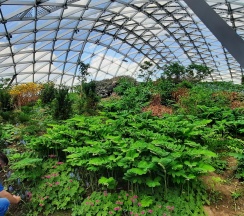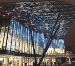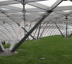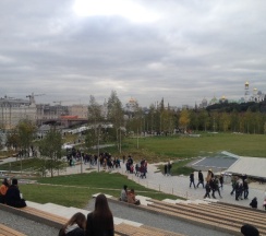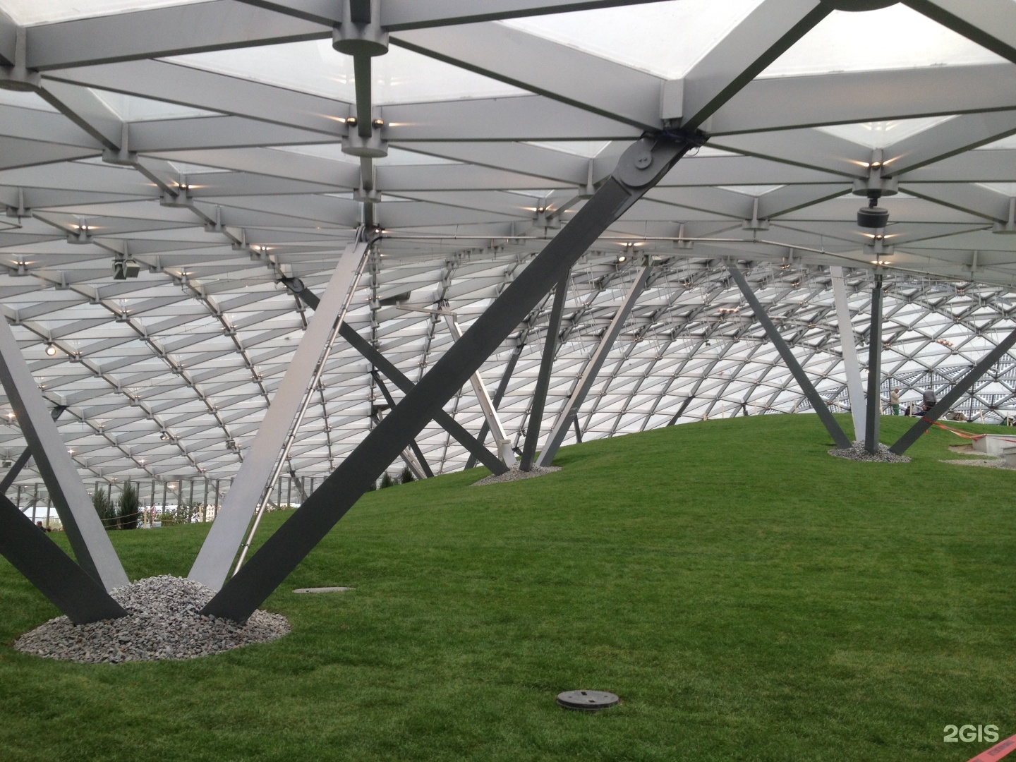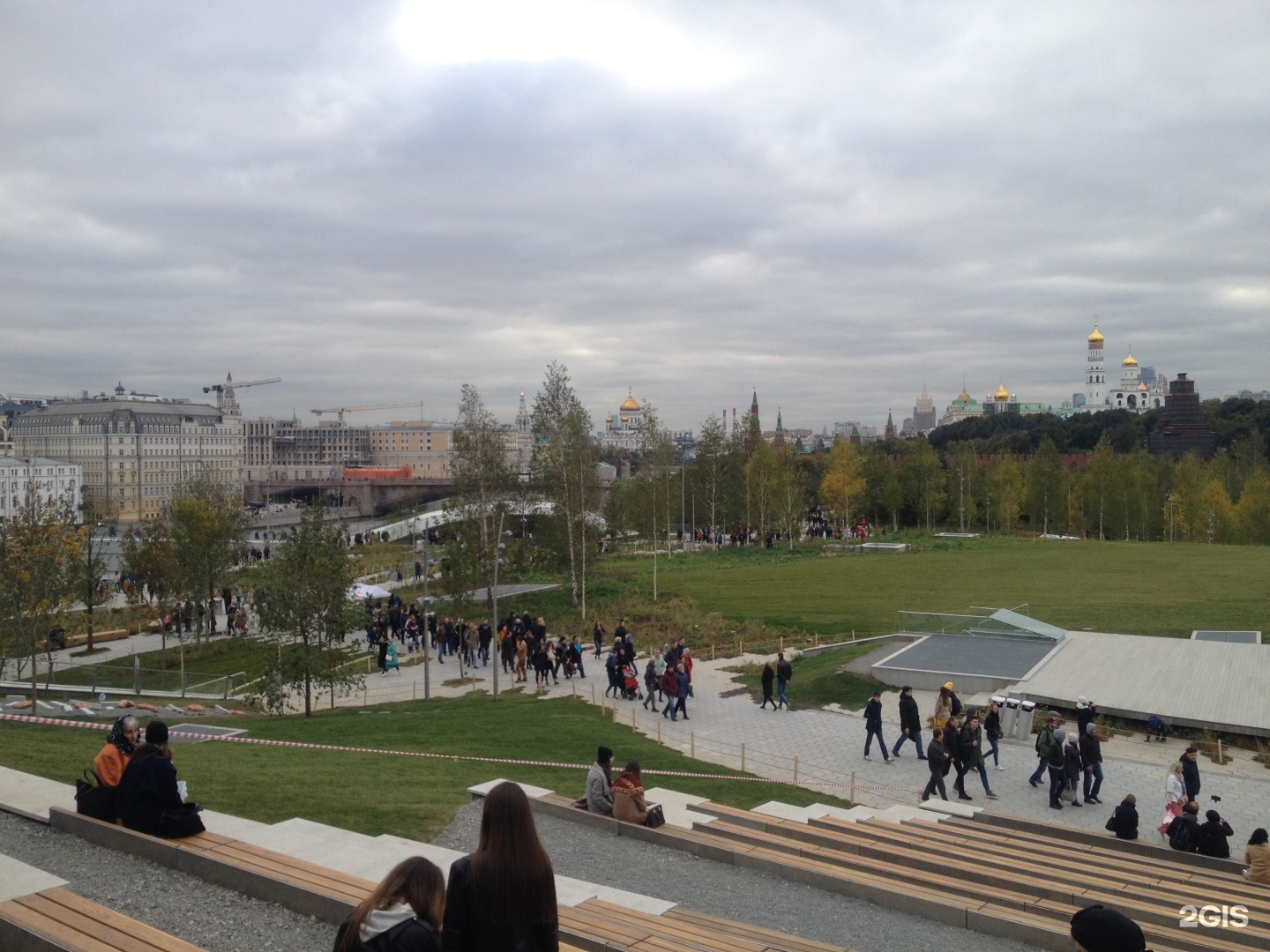Здание Зала Зарядье вписано в структуру искусственного рельефа парка. В числе архитектурных особенностей здания – «стеклянная кора», светопрозрачная конструкция без ограждающих стен. К зданию примыкают два открытых амфитеатра — большой на 1600 мест и малый с медиаэкраном на 400 мест.