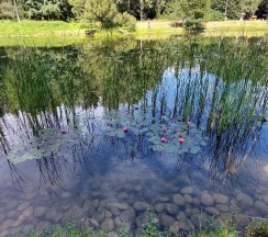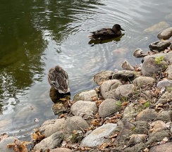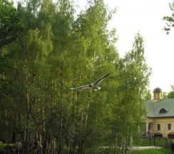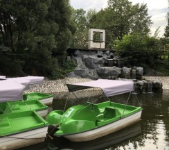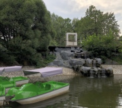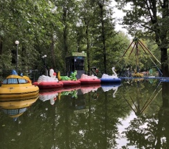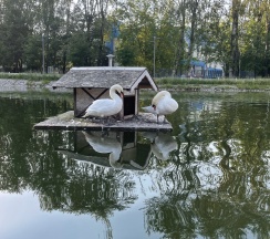 В водоеме плавают пара красивых белых лебедей и их два детёныша, дети уже почти с родителей, но они серой расцветки Лебеди плывут за их кормильцем- охранником, куда он, туда и они! Парк большой,мы мало успели походить.