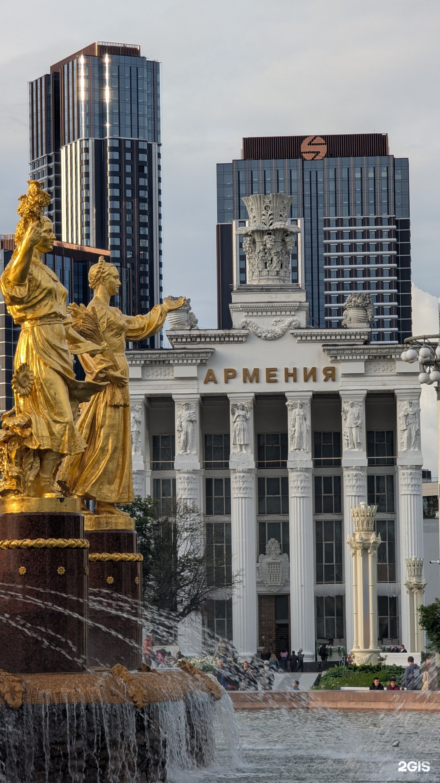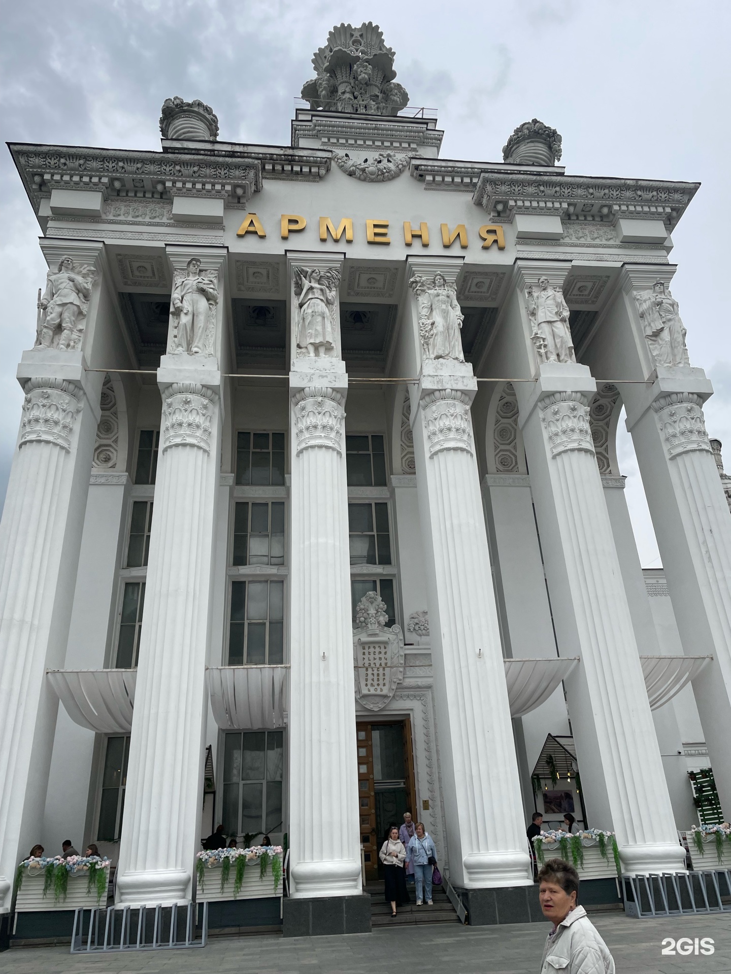Портик здания венчают рога изобилия, из которых высыпаются сочные плоды, а под ними надпись «Армения». Все это символизирует новое назначение павильона, где с 2003 г. работает Выставочно-коммерческий центр Республики Армения.