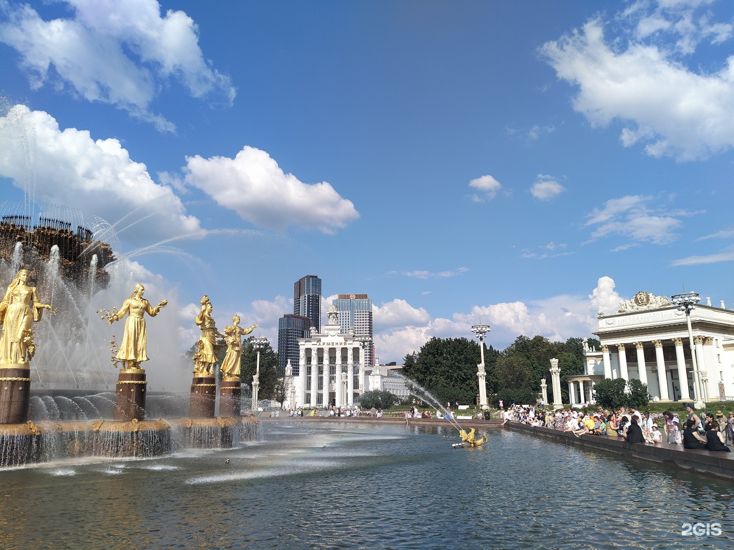 Но как бы напоминая о том, что изначально здесь располагался павильон Сибири, над причудливыми капителями колонн на фронтальном фасаде мы видим фигуры мощных сибиряков. Это пышное оформление выполнили скульпторы З.С. Снигирь, О.К. Сомова, Т.Ф. Смотрова, Н.И. Абакумцев, а главным художником павильона был Г.Б. Гусак.