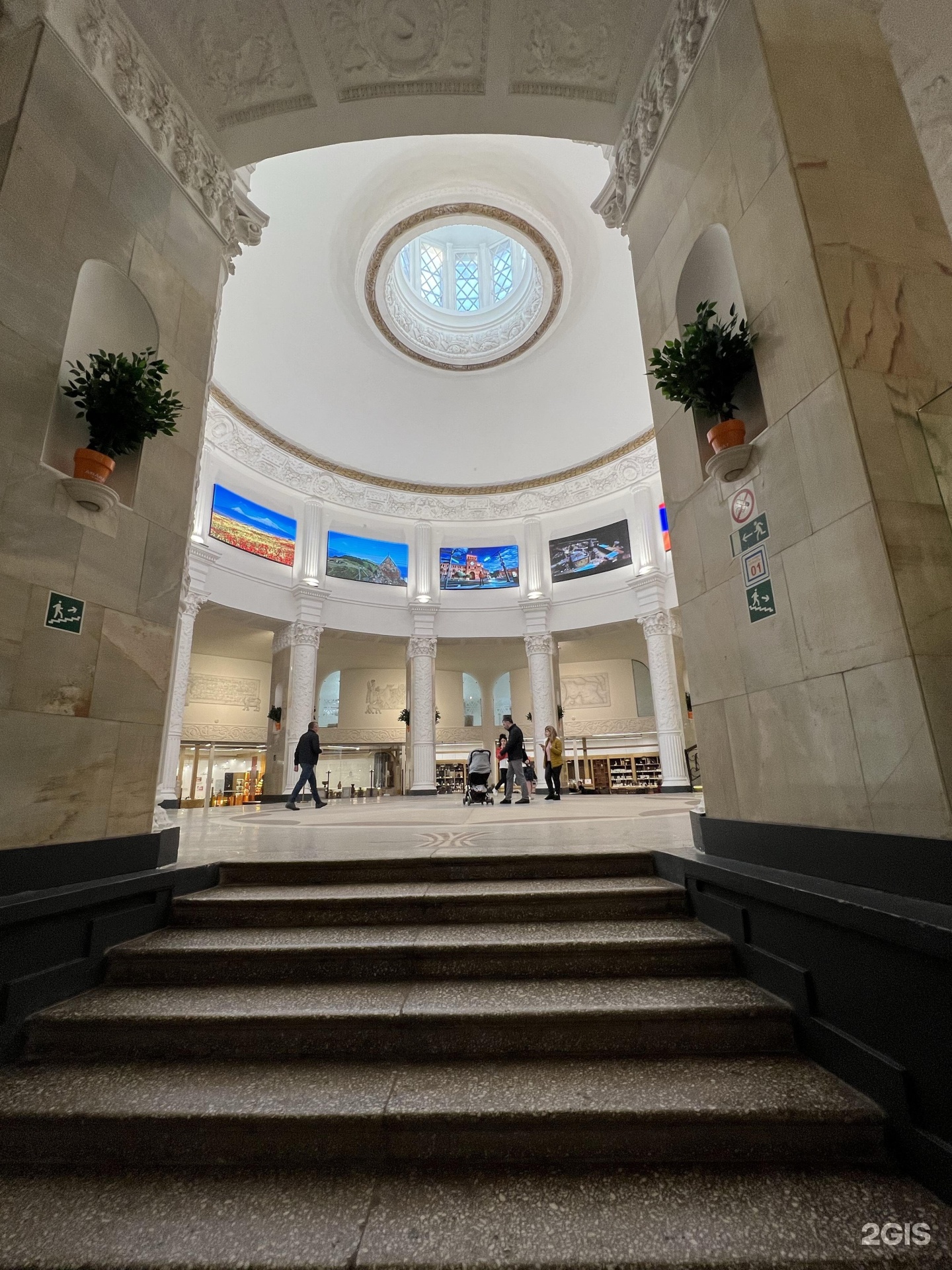 Огромное здание имеет сложную шестиугольную форму, что позволило разместить выставочные площади вокруг высокого центрального зала, перекрытого куполом.