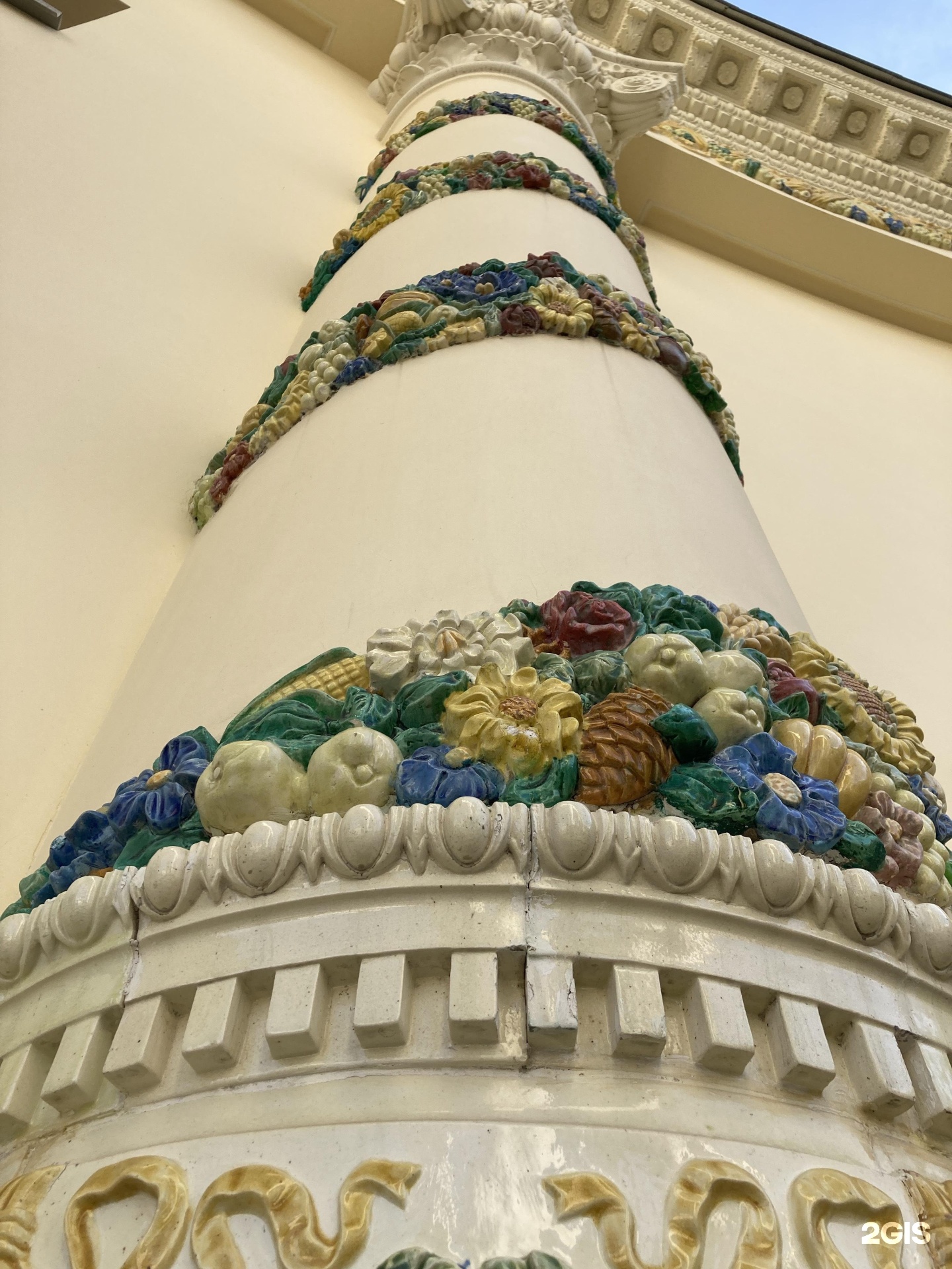 Фасад павильона украшает монументальная колоннада, за ней скрывается открытый полукруглый дворик, вымощенный керамической мозаикой. Здание украшают барельефы из майолики в виде красочных гирлянд из плодов и цветов, которыми обвиты колонны; присутствует национальный орнамент. Над центром здания высится башня, увенчанная аллегорической скульптурой «Родина» со снопом и венком (скульптор А.О. Бембель).