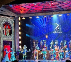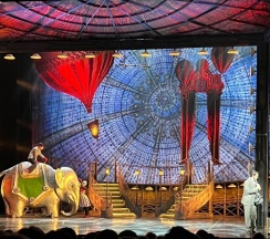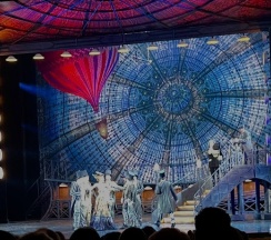 В спектакле очень красивые декорации (художник-постановщик - заслуженный художник России Максим Обрезков). В первой части действие происходит на крыше с небольшой стеклянной надстройкой, где трудится скульптор, а его друзья пишут оперетту "Карамболина". На заднем плане благодаря видеодекорациям сменяются погода и время суток, хмурится погода или появляется великолепная луна. С разных выходов на эту крышу то и дело поднимаются разные персонажи. Кроме обычных статуй, во время одной из песен появляются однотонно загримированные девушки, изображающие статуи. Очень неожиданно и оригинально. Вторая часть проходит уже в театре на сцене или в закулисье, либо на улице, поэтому декорации периодически меняются, но основа - подиум-лестница и видеодекорации. Очень понравилась задумка с нарциссами, когда опустилось полотно, напоминающее черный трафарет с цветами, а на заднем плане, где видео, стали появляться неаккуратные кляксы акварели, и цветы в трафарете постепенно обрели цвет. Стильно, и я такого еще нигде не видела. Естественно, ко всему этому необходима тонкая работа со светом, таковая она и была (художник по свету Иван Виноградов). Ну и если я говорю о Московском театре оперетты, то я не устаю говорить о роскошнейших изумительных костюмах (художники по костюмам Екатерина Гутковская и Анастасия Пугашкина). Просто глаз было не отвести от всего, начиная от пышных нарядов и заканчивая украшениями головы, даже от простенького, казалось бы, платья Виолетты.