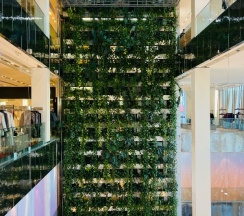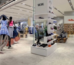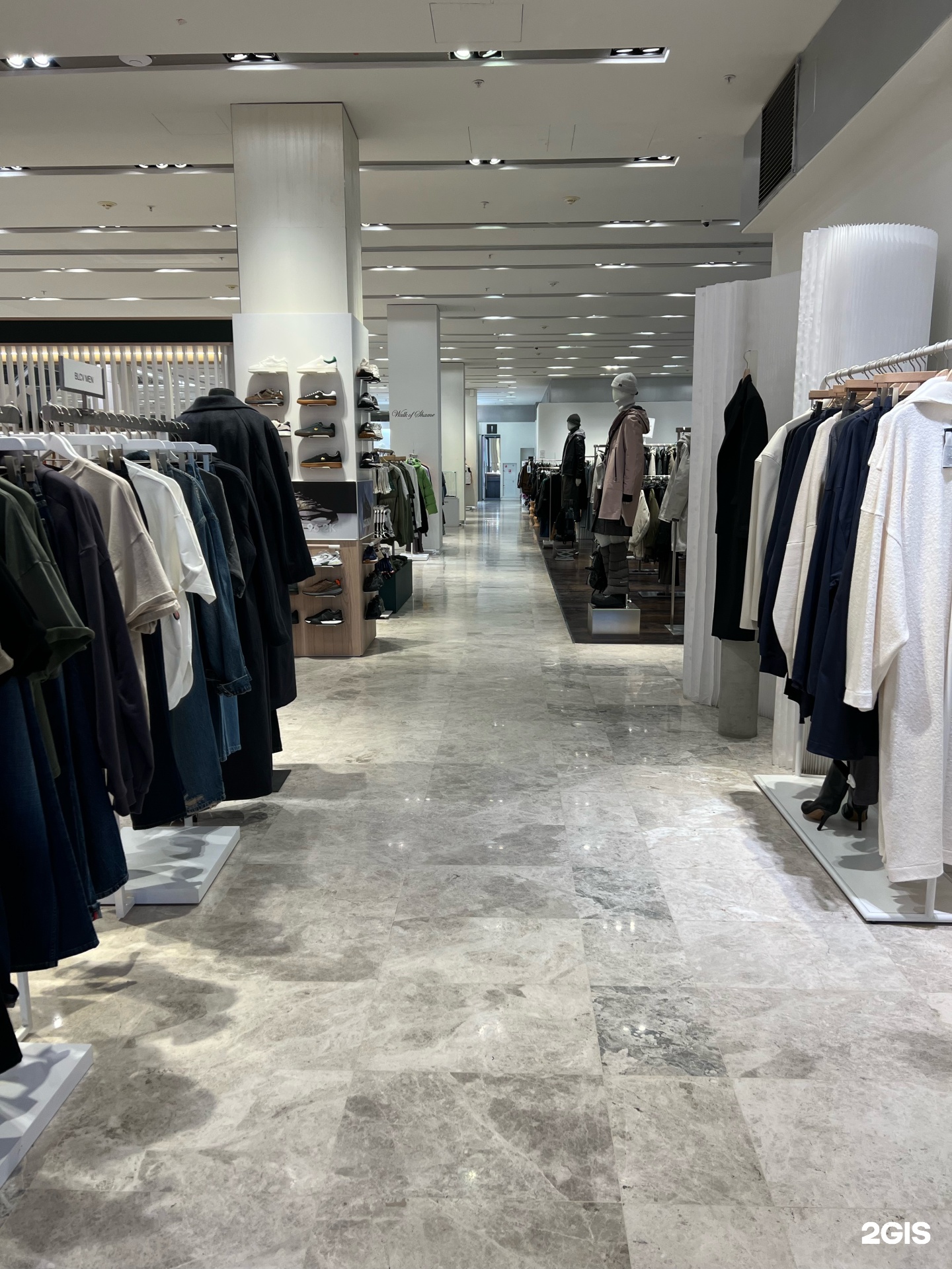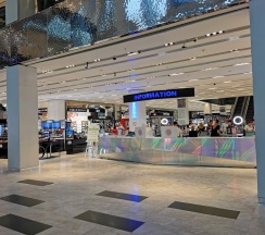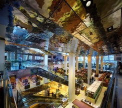 Также вызывает интерес и интерьер внутренних помещений универмага. Например, потолок этажа, который занимает зона фуд-корта. Он состоит из золотистых металлических элементов, которые отражают свет в разные стороны.