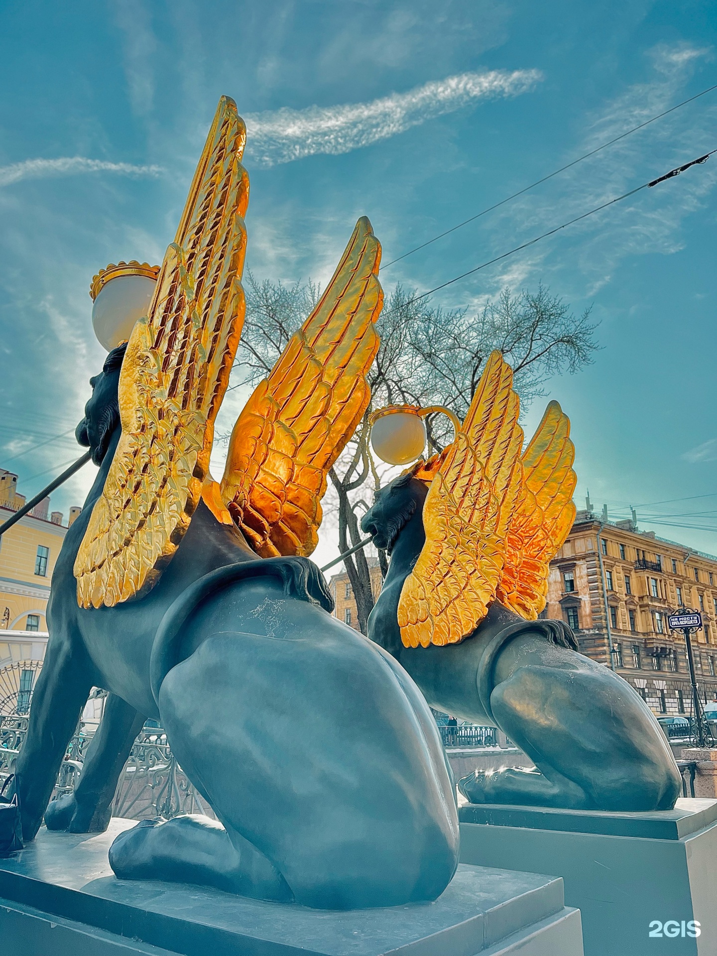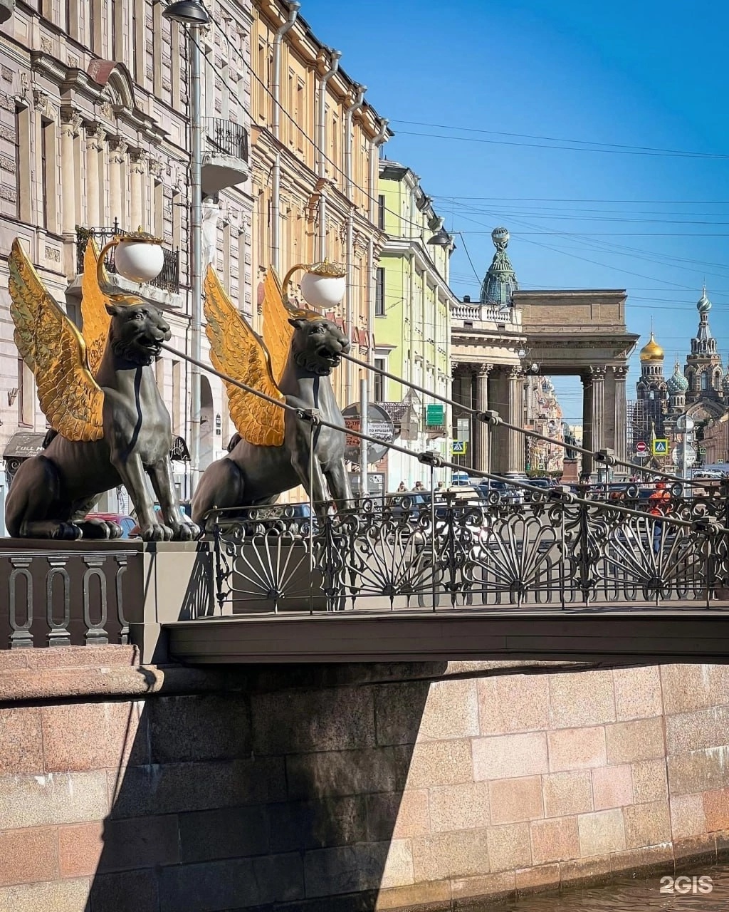 Банковский мост был построен в 1825-1826 годах по проекту инженеров В. Фон Треттера и Е. А. Адама, является одним из трёх висячих мостов, сохранившихся до настоящего времени в Петербурге. Особую известность мосту принесли угловые скульптуры грифонов — литые фигуры мифических животных с медными позолоченными крыльями. Согласно мифам Древней Греции, грифоны являются надёжными стражами кладов, именно поэтому они были выбраны в качестве декоративного оформления моста у здания банка.