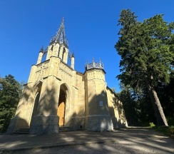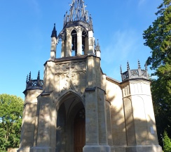 Склеп также выполнен в готическом стиле со стрельчатой чугунной аркой перед входом.