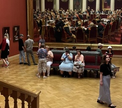 4. Духота + микс просто посетителей, которые самостоятельно пришли насладиться выставкой, и экскурсионных групп. Нормально ходить и наслаждаться работами невозможно, толпы-толпы-толпы. Позабавило, когда экскурсовод намекнул кому-то в зале, кто примкнул к группе, что экскурсия на конкретное количество человек рассчитана, да только там так тесно, что невольно ты будто к группе и примыкаешь, экскурсовода слышно в любом углу комнаты.