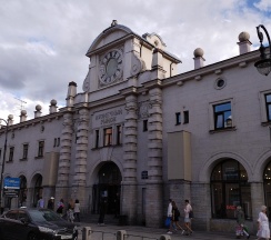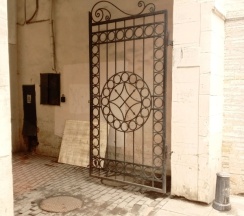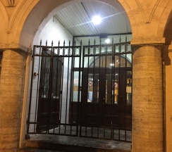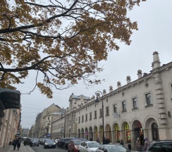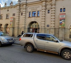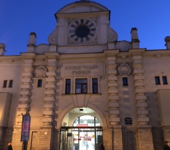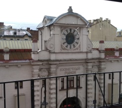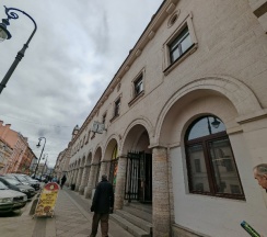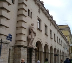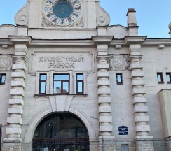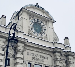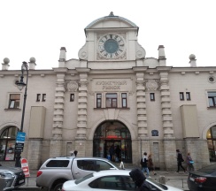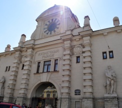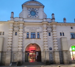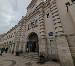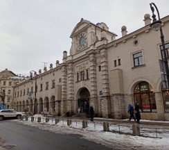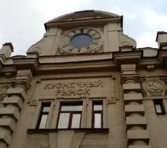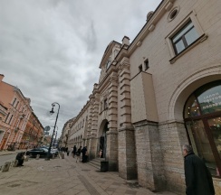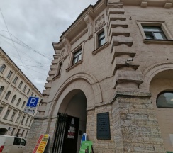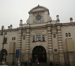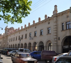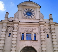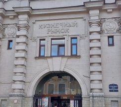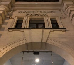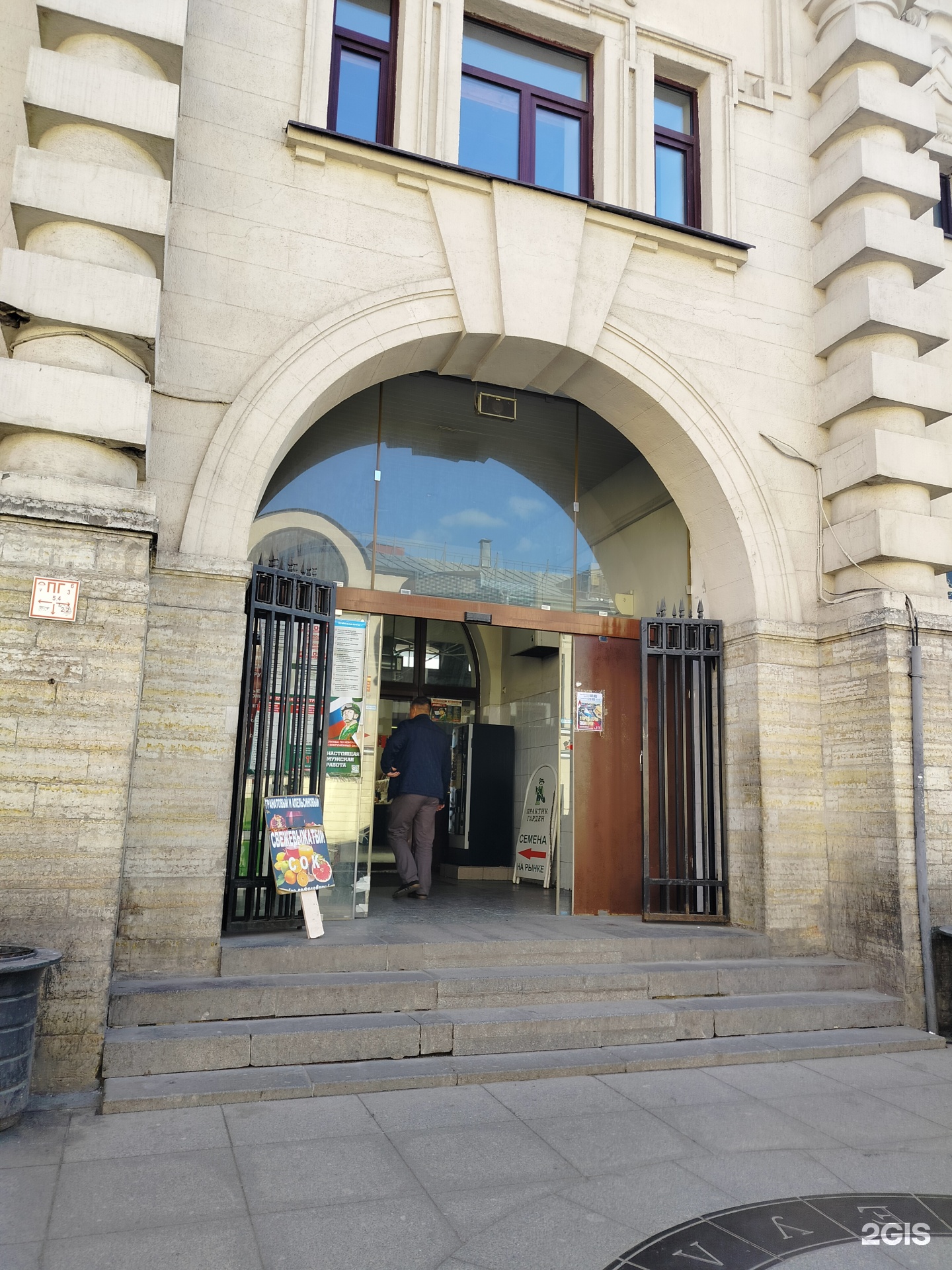 Рынок в старинном здании. Рядом дом с красивой парадной