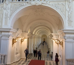 Фасад Малого Эрмитажа обращен к Неве, отличается богатством архитектурных форм. Он украшен шестью колоннами, а так же статуями Флоры и Помоны. Фасад, выходящий на Миллионную улицу повторяет мотивы фасада Зимнего дворца. Особого внимание во внутренних интерьерах Малого Эрмитажа заслуживает двухсветный белый мраморный зал. Памятник архитектуры 18 века. Охраняется государством.