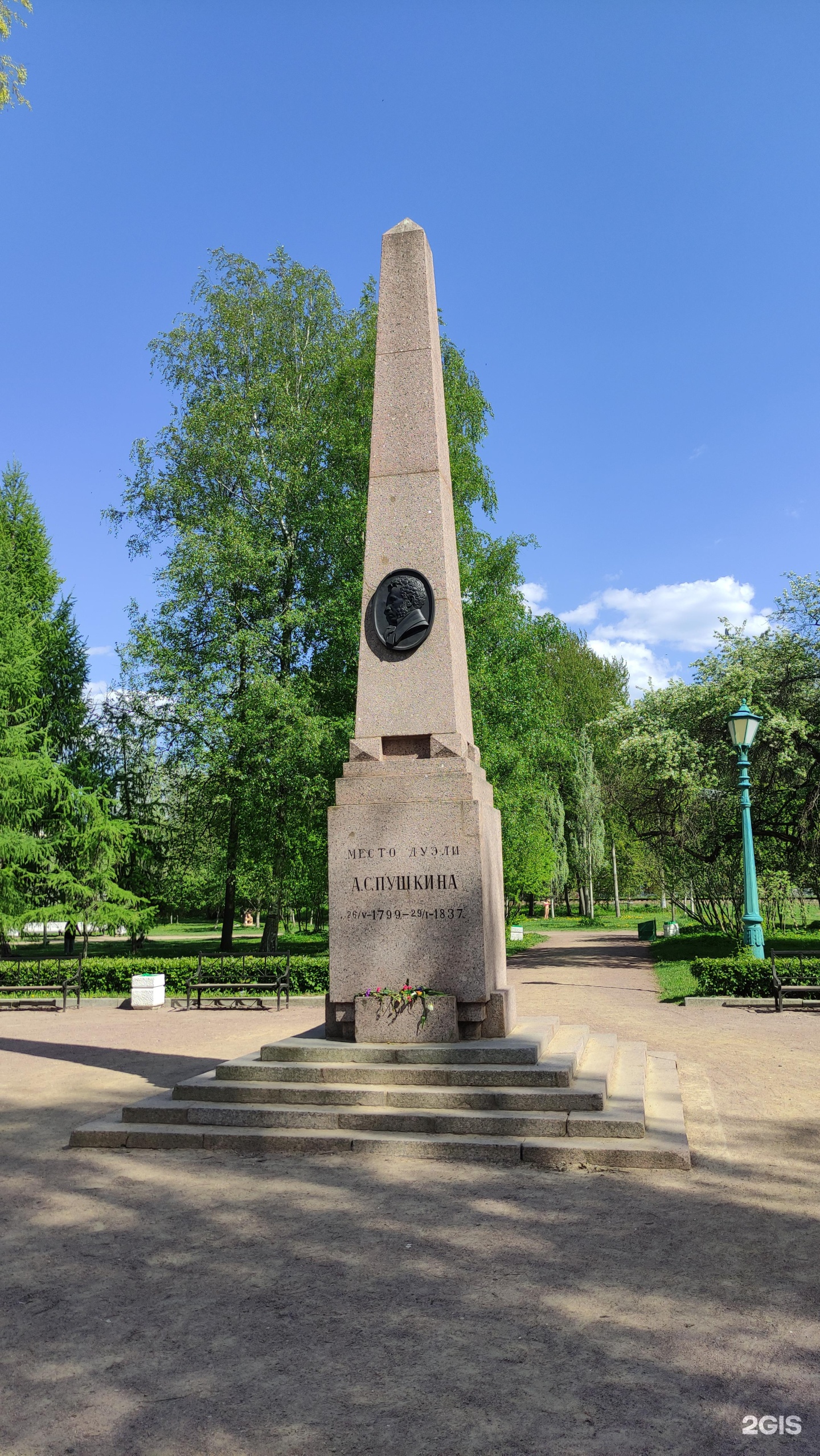 Первый памятный знак на месте дуэли поэта был установлен лишь в 1932 году, место установки является приблизительным. В 1936-1937 годах, к 100-летию со дня смерти А.С. Пушкина, были проведены работы по благоустройству сквера и установлен памятный гранитный обелиск с барельефным изображением поэта; общая высота обелиска 9 м.