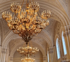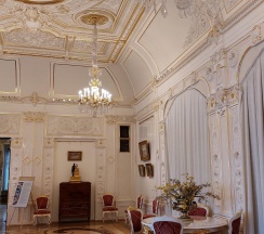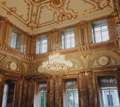Интерьеры поражают своей роскошью и продуманностью деталей. Особенно запомнился Мраморный зал на втором этаже, украшенный разнообразными сортами натурального камня и потрясающим живописным плафоном «Свадьба Купидона и Психеи». Барельефы на стенах создают ощущение погруженности в древнегреческий мифологический сюжет, а огромные окна наполняют помещение мягким светом.