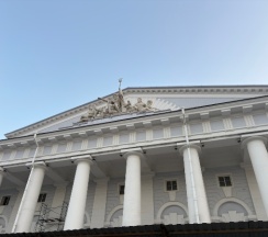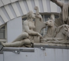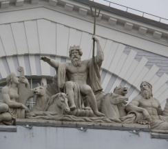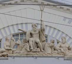На фронтонах размещены скульптурные группы. На восточном, обращённом на Стрелку – композиция «Нептун с двумя реками», на западном – «Навигация с Меркурием и рекой».