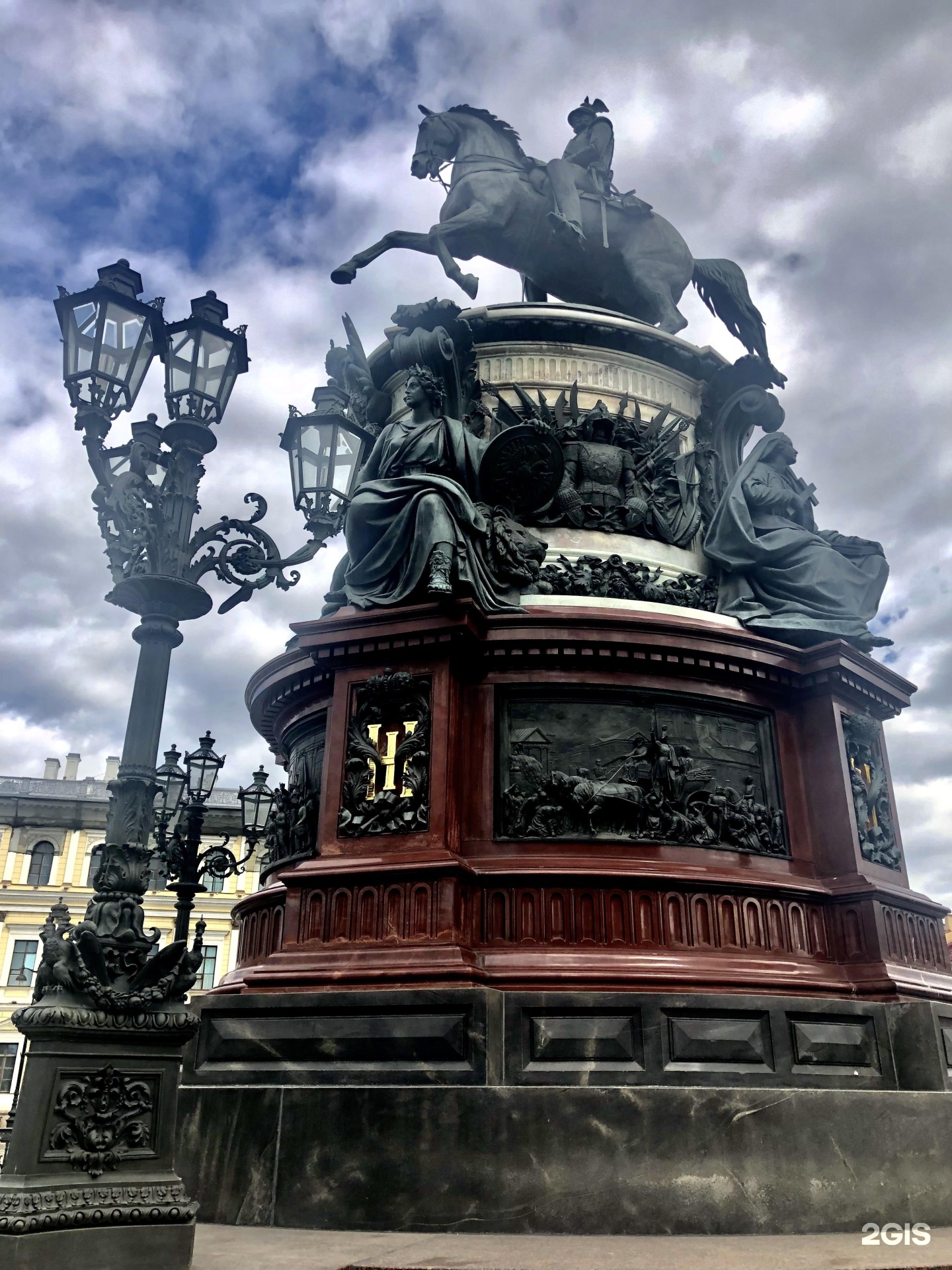 Уникальность памятника Николаю I состоит в том, что тяжёлый всадник имеет всего две точки опоры (задние копыта коня). Устойчивость монументу придают пуды дроби, засыпанные в круп коня, а также металлические столбы под копытами задних ног коня, идущие сквозь пьедестал до его основания. Николай I изображён в парадном мундире, на его голове – каска с орлом. Пьедестал монумента украшают аллегорические фигуры Веры, Мудрости, Правосудия, Силы. Лица фигур имеют сходство с чертами жены и дочерей императора. Высота конной статуи 6 метров, общая высота памятника 16,3 метра.