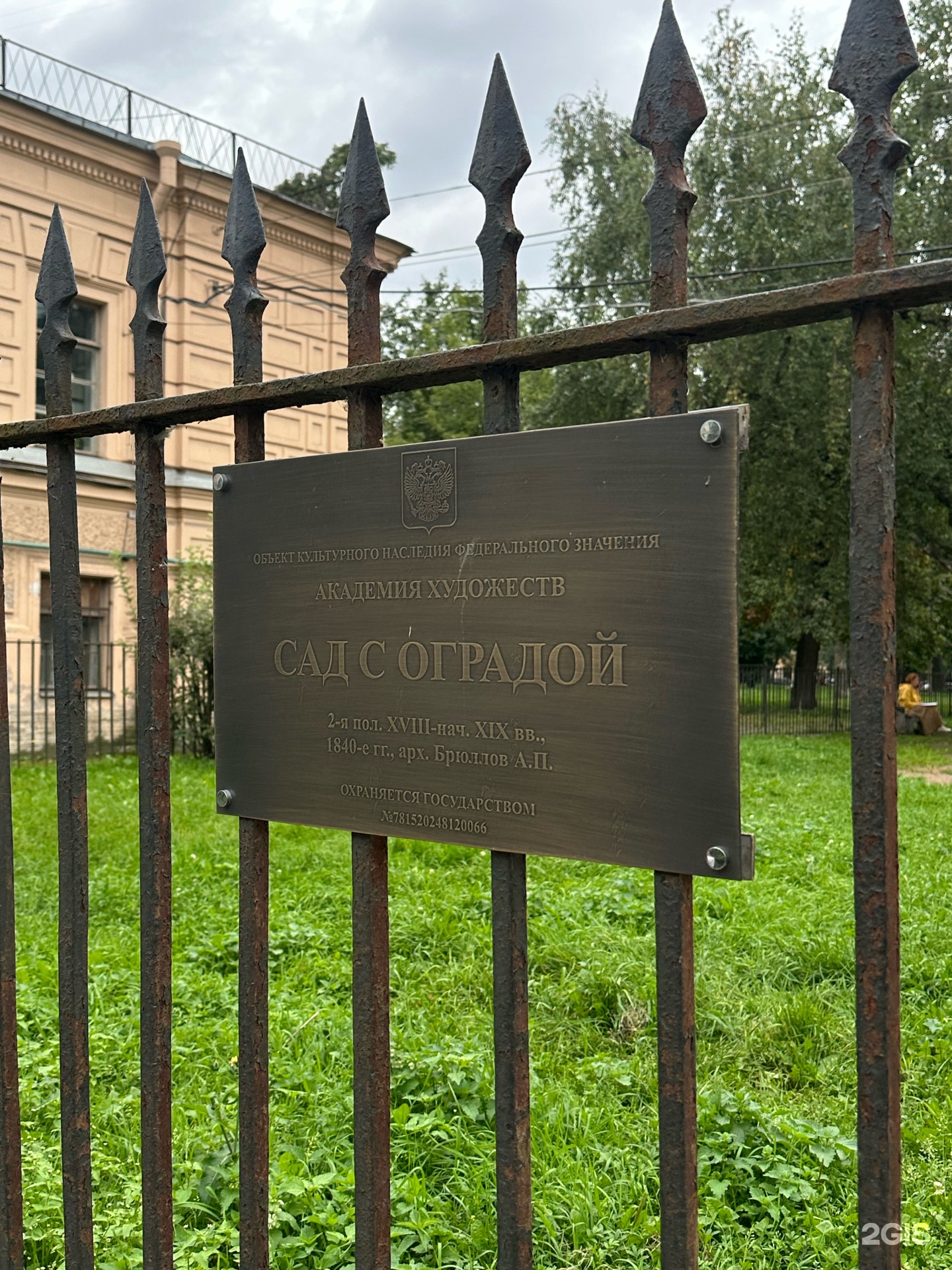 Старинный внутренний сквер при Академии художеств. Планировка сада, намеченная А.П. Брюлловым, сохранилась до наших дней. Здесь в разные времена практиковались студенты-художники. В 1847 году в саду была установлена гранитная колонна, которая являлась ранее запасной при строительстве Казанского собора.